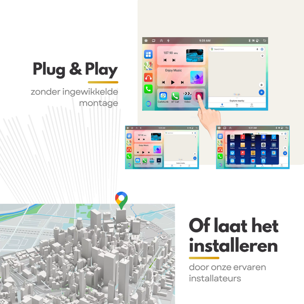 Dankzij het plug & play ontwerp kan vrijwel iedereen deze autoradio eenvoudig zelf installeren. Alle benodigde kabels, aansluitingen en inbouwonderdelen worden meegeleverd voor een probleemloze montage. Wil je liever dat alles perfect wordt geplaatst? Maak dan gebruik van onze professionele installatieservice. Onze specialisten zorgen voor een nette en veilige montage, zodat jij direct kunt genieten van jouw nieuwe multimediasysteem zonder zorgen.